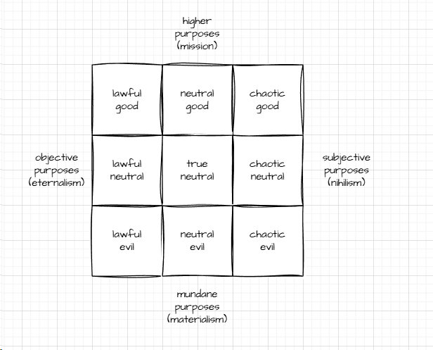 Philosophies can often be understood metaphorically, and few metaphors are as widely recognized as the alignment grid from Dungeons & Dragons. Typically used to categorize characters by ethics (Lawful, Neutral, Chaotic) and morality (Good, Neutral, Evil), it also provides an insightful lens for exploring philosophical systems.