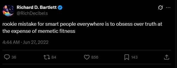 “Rookie mistake for smart people everywhere is to obsess over truth at the expense of memetic fitness.”