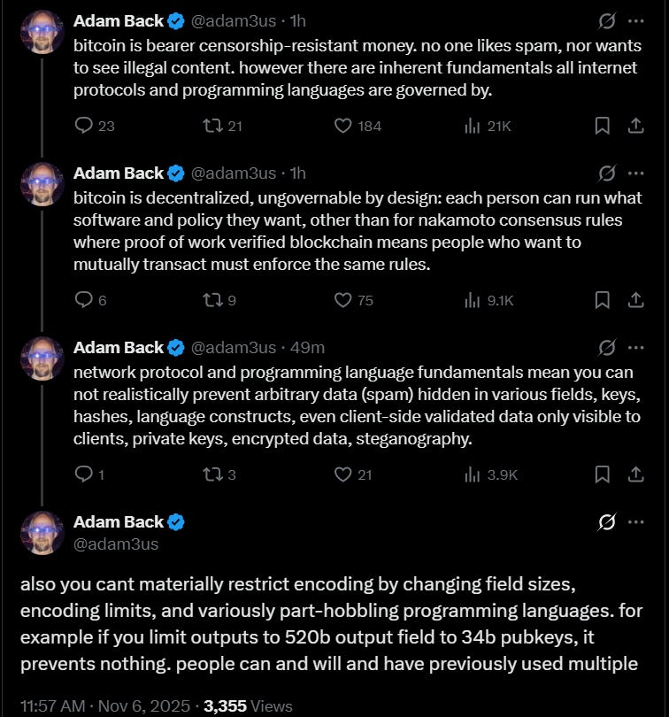 Adam Back’s thread is a concise defense of Bitcoin’s fundamental ungovernability. It articulates a principle that extends far beyond cryptocurrency: when a system is both open and computationally expressive, attempts to regulate its substrate are inherently futile.