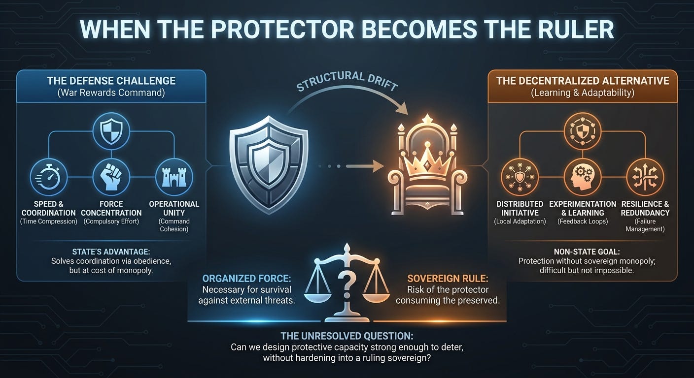 The standard statist move is to point to the difficulty of the problem and then smuggle in the conclusion that sovereignty is necessary. That move still fails. Hard coordination problems require careful design. They do not automatically justify coercive monopoly. The anti-state case, however, must now be phrased more carefully as well. It is not enough to say that a private defense shell is plausible in the abstract. The stronger and more disciplined claim is that the necessity of defense does not by itself prove the necessity of sovereignty, and that the unresolved task is to design protective capacity strong enough to deter external threats without becoming a sovereign itself.