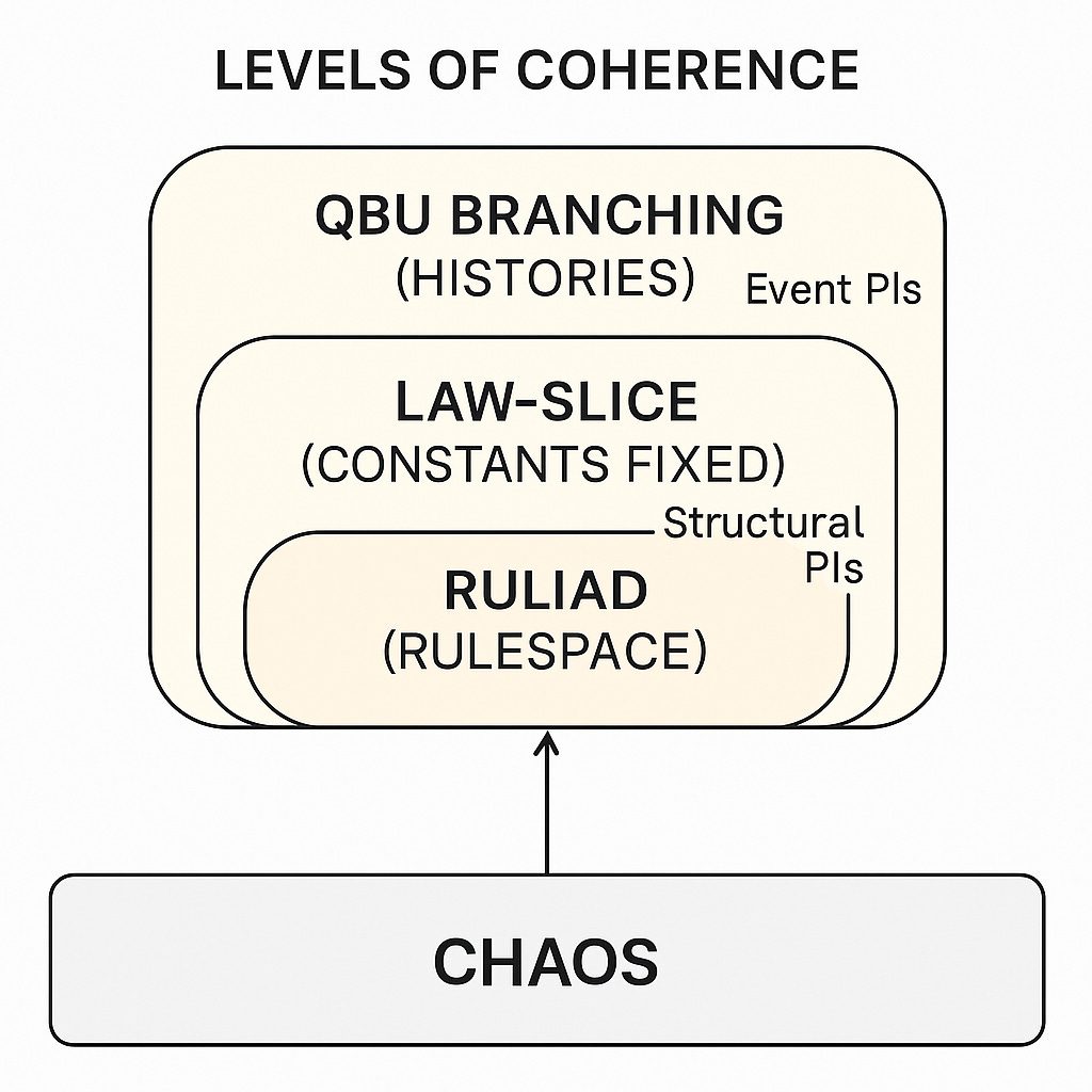 The Chaos/Coherence + Ruliad + QBU model yields a clear three-tier hierarchy: