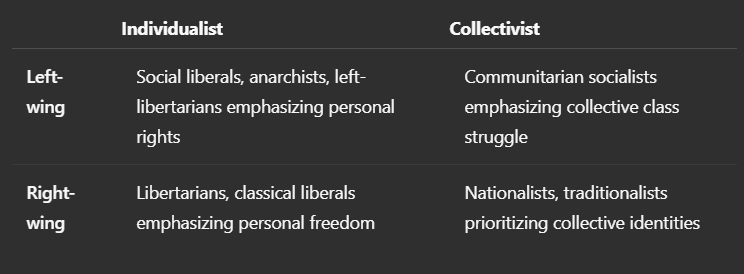 Political ideologies on the traditional left-right spectrum are often organized around economic policies, governance structures, and wealth distribution. However, collectivism-individualism concerns the ethical and ontological primacy of groups versus individuals.