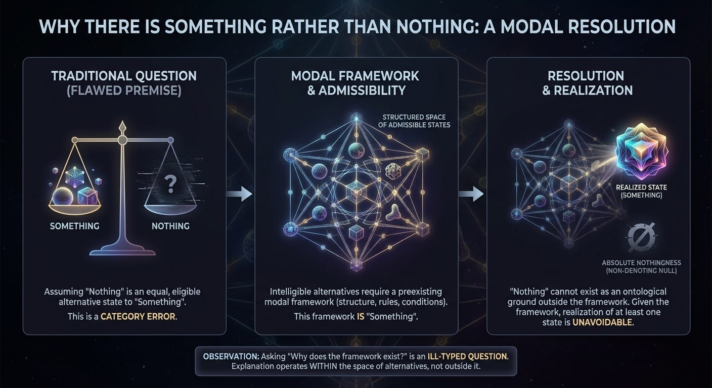 At this point a familiar meta-question arises: why does the modal framework itself exist rather than not exist? This question is not deeper than the original; it is ill-typed. Explanation operates within a space of admissible alternatives. Asking why that space exists attempts to step outside the conditions under which explanation is possible at all.