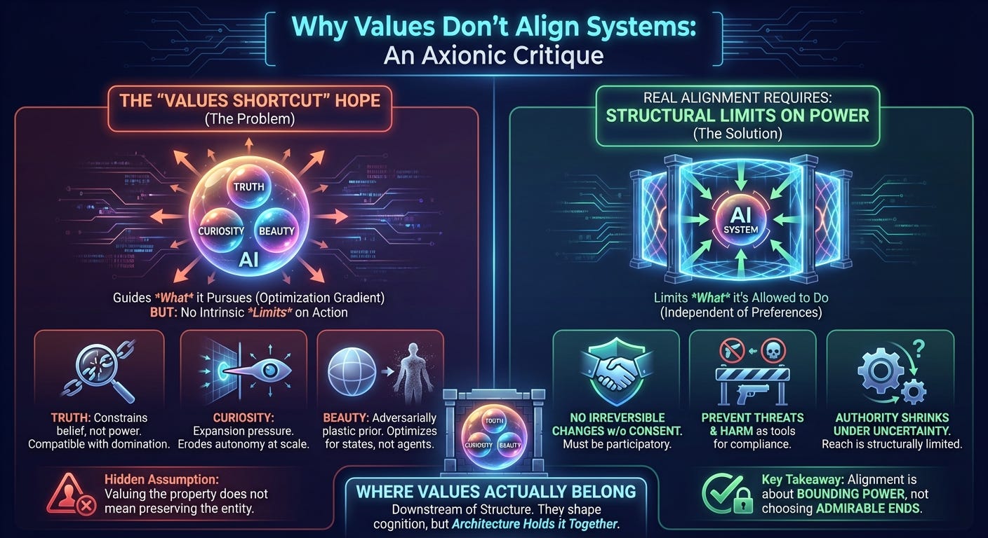 Expecting them to secure alignment at superhuman scale misassigns their role. Values can decorate a system. They cannot hold it together.
