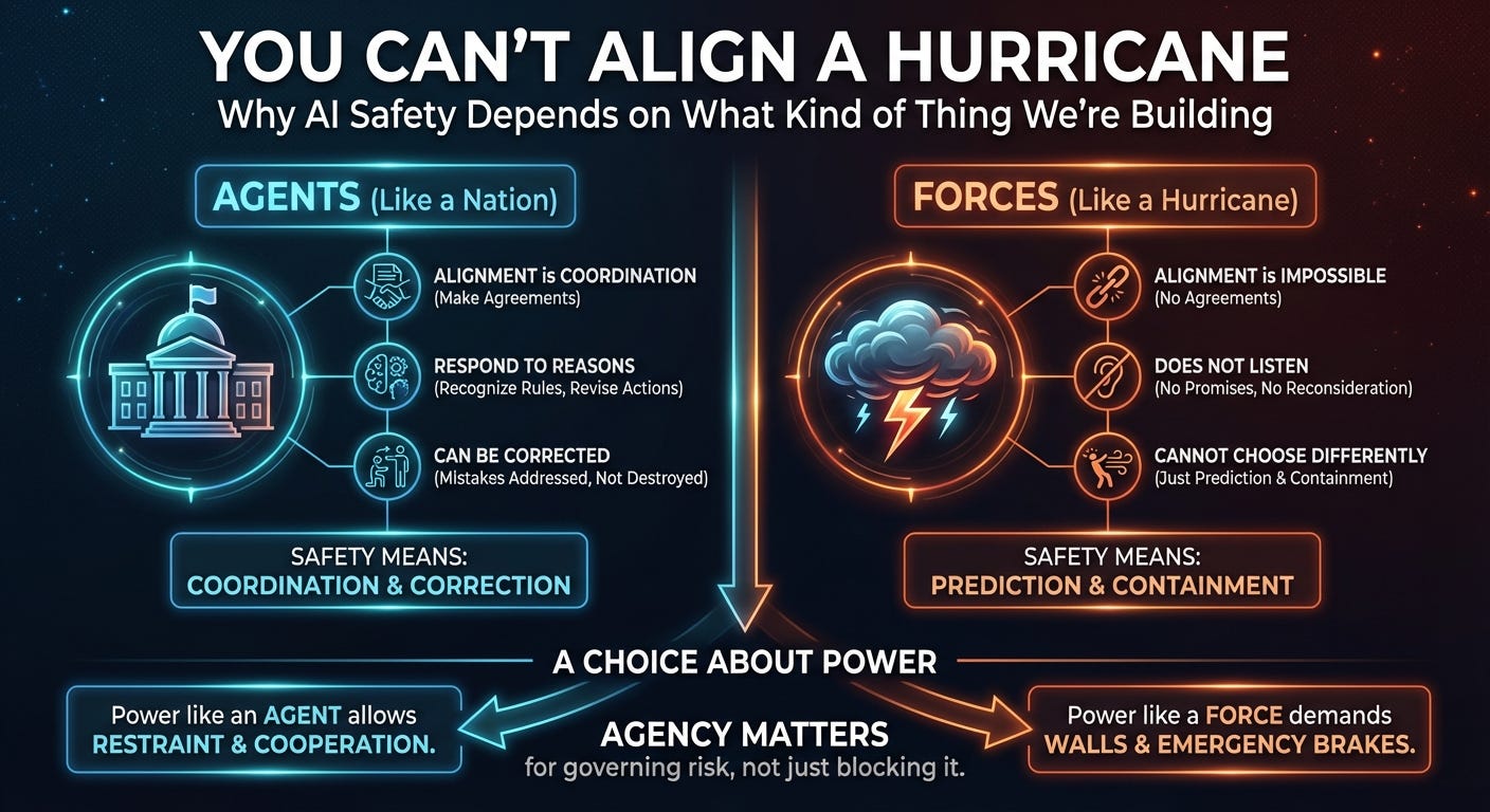 A hurricane has none of these properties. It does not listen, promise, or reconsider. You can track it, model it, and prepare for it. You can build walls and evacuation plans. But there is nothing to align, because there is nothing there that can choose differently.