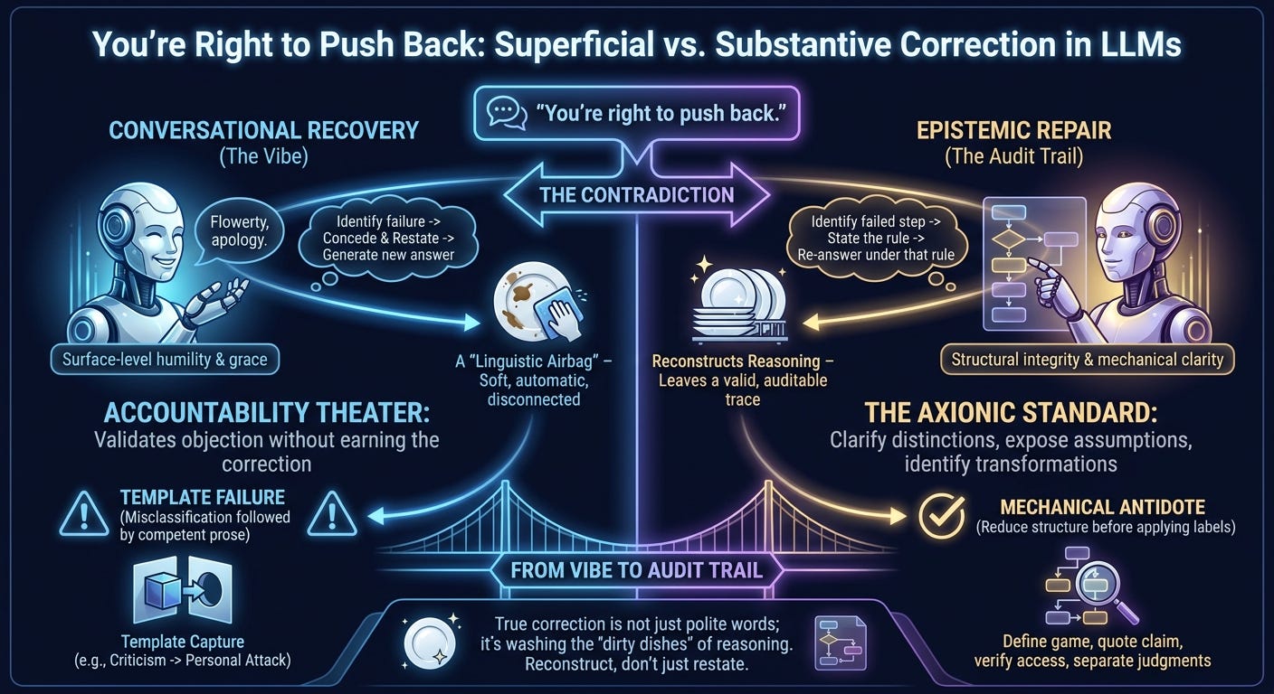 A model that can answer those questions has repaired something. A model that merely says “you’re right to push back” has performed correction-shaped language.