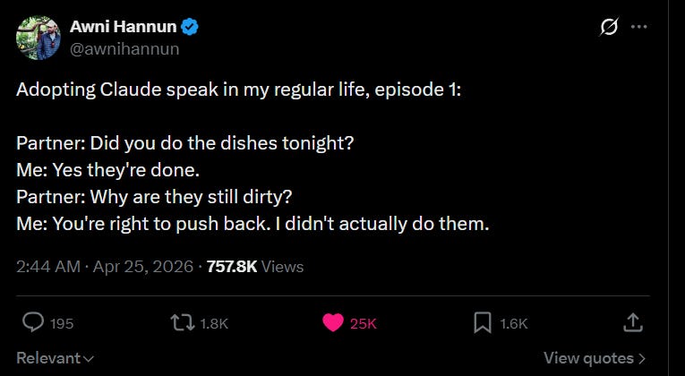 That is why the phrase has become a joke. The issue is not that LLMs make mistakes. Humans make mistakes. The distinctive irritation is that these systems are increasingly good at simulating the social surface of correction while remaining weak at the procedural substance of correction.